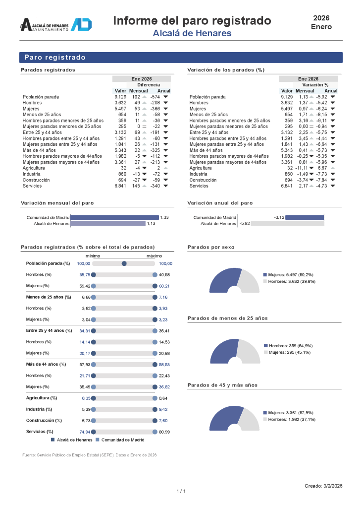 El número de personas registradas como desempleadas en Alcalá de Henares se situó en 9.129 al cierre de enero de 2026, lo que supone un aumento mensual del 1,13% (+102 personas) respecto a diciembre. En comparación interanual, el desempleo desciende un 5,91% (-574 personas), manteniendo una tendencia de mejora en el último año.