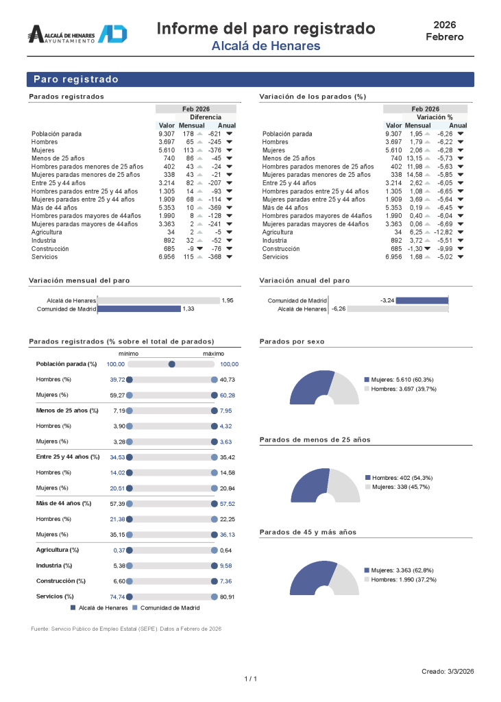 Datos de desempleo del mes de febrero 2026 en Alcalá de Henares 1562 2187 Alcalá Desarrollo