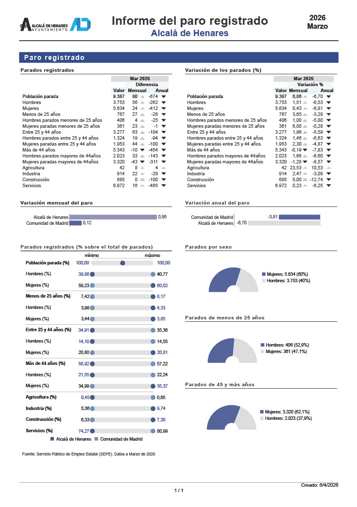 El número de personas registradas como desempleadas en Alcalá de Henares se situó en 9.387 al cierre de marzo de 2026. En comparación interanual, el desempleo desciende un 6,70% (-674 personas), lo que supone una aceleración en la tendencia de mejora respecto al año anterior.