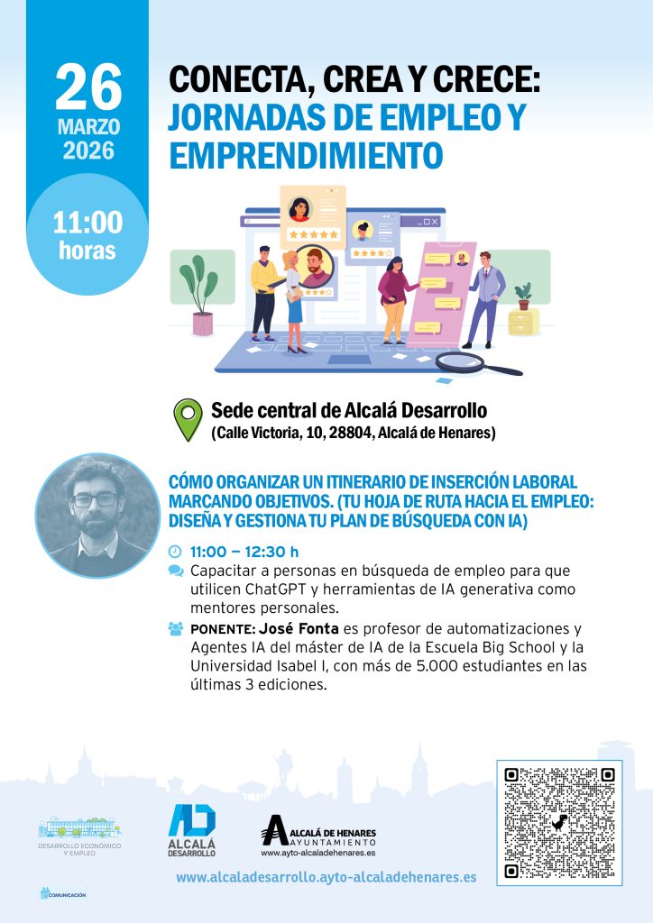 Dentro del ciclo de jornadas formativas “Conecta, crea y crece: jornadas de empleo y emprendimiento”, que Alcalá Desarrollo ha preparado para el curso 2025/26, te invitamos a participar en la próxima, una jornada imprescindible para quienes quieren impulsar su futuro profesional: