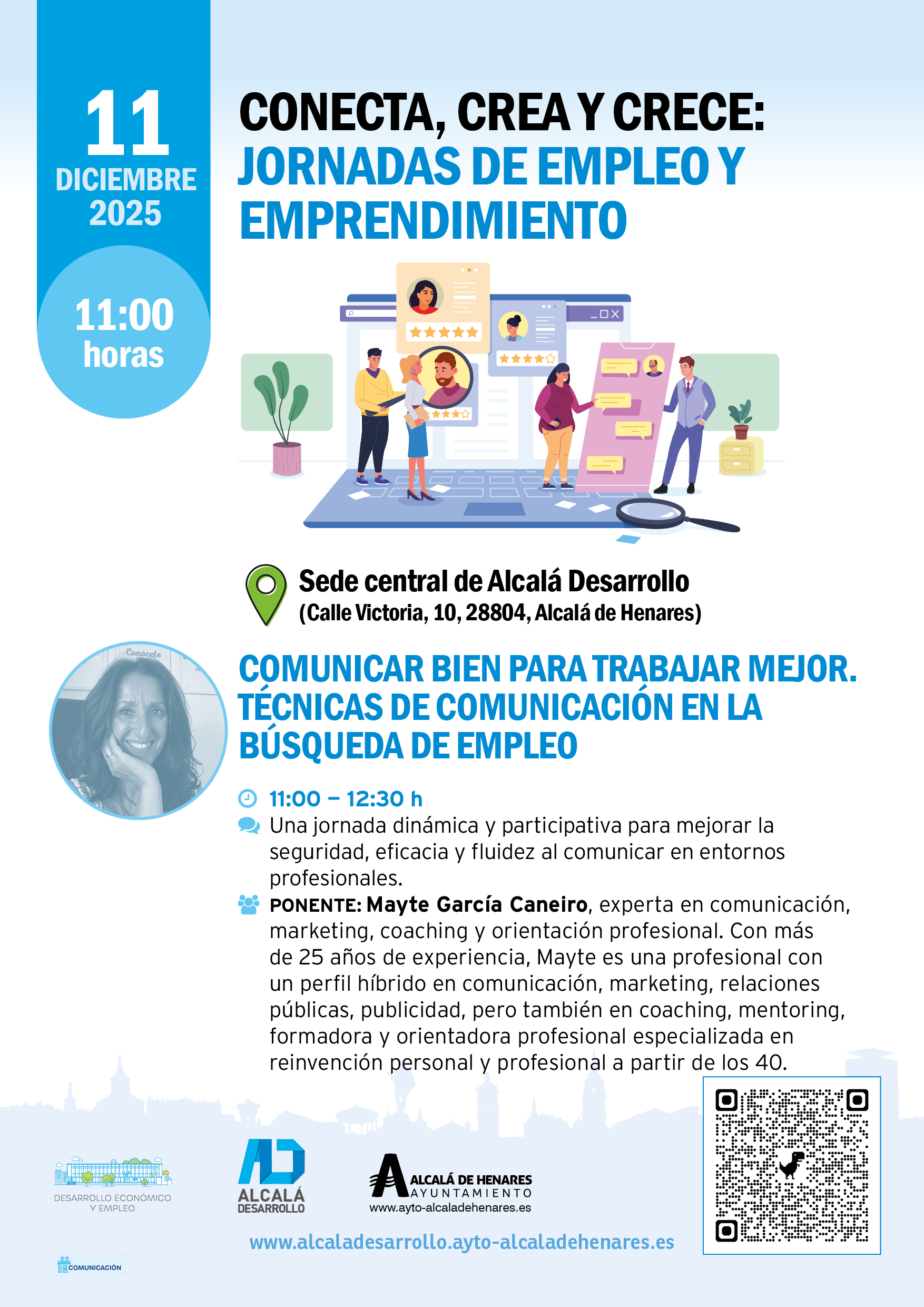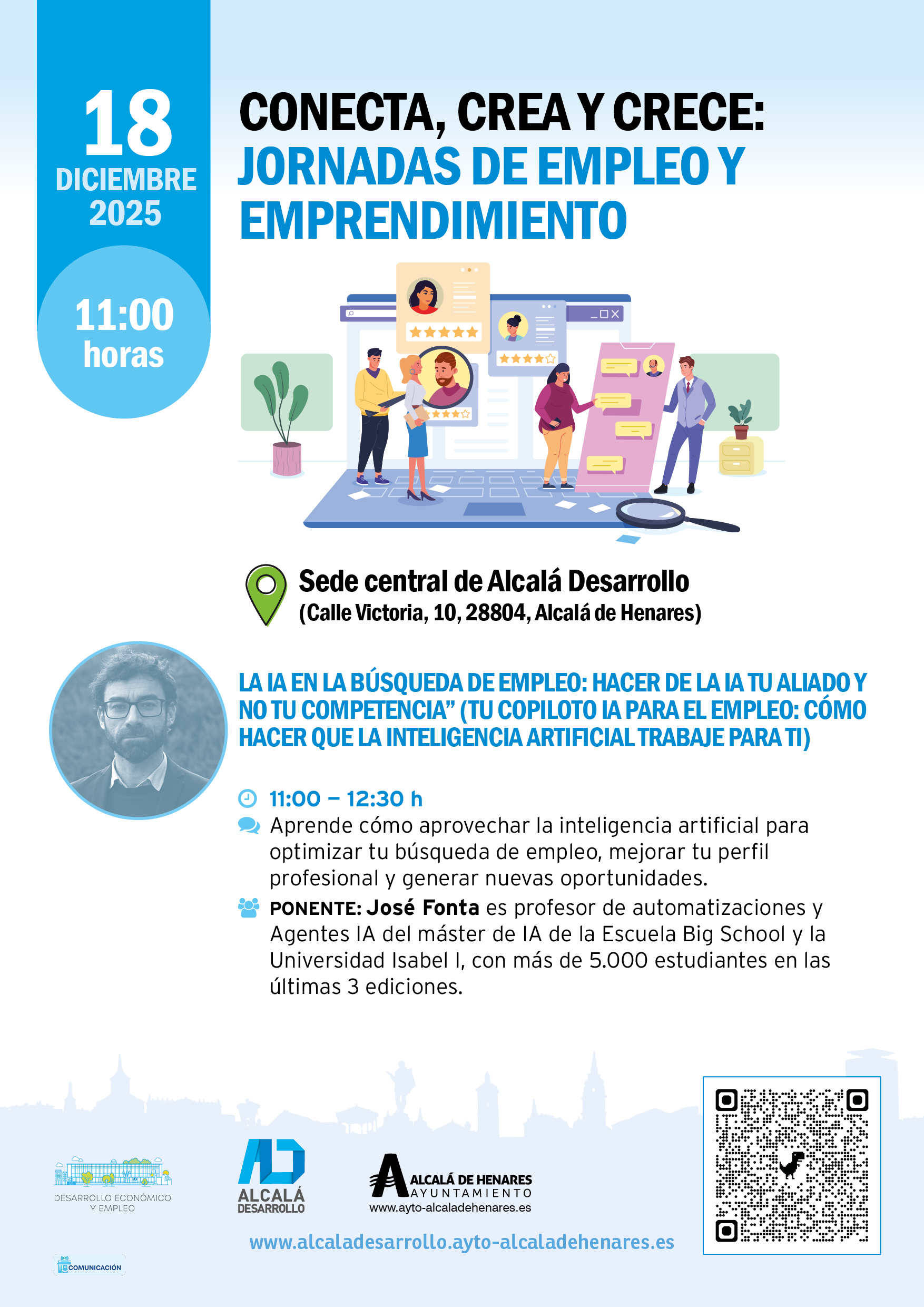 calle Victoria, 10, 28802 de Alcalá de Henares Calle Victoria, 10, Alcalá de Henares, Madrid¡Inscríbete ya en la siguiente jornada del ciclo “Conecta, crea y crece”! Dentro del ciclo de jornadas formativas “Conecta, crea y crece: jornadas de empleo y emprendimiento”, que Alcalá Desarrollo ha preparado para el curso 2025/26, te invitamos a participar en la próxima, una jornada imprescindible para quienes quieren impulsar su futuro profesional: 📅 Jueves… Continue Reading Prepara tus entrevistas de trabajo de forma efectiva gracias a la inteligencia artificial